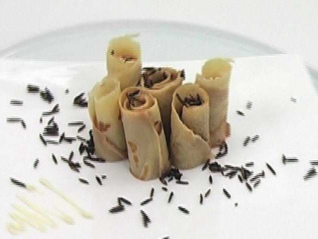 Эксклюзивный десерт.Состав:подсолнечное масло — 200 гр;сгущенка — 1 банка;дикикй рис — 30 гр;сладкие блинчики — 2 штуки.