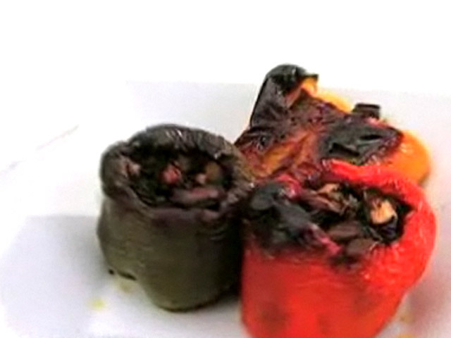 Вкусное блюдо из Италии.На 3 порции:перец — 3 штуки;дикий рис — 1/2 чашки;зеленый лук — 1 пучок;баклажаны — 3 штуки;оливковое масло, черный перец, лимонный сок, соль.