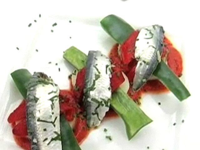 Низкокалорийное блюдо из сардин. 293 калорий.Состав:филе сардины — 2 штуки;перец — 2 штуки;картофель — 1 штука;вода — 1/2 чашки;винный уксус — 2 столовых ложки;чеснок — 1 зубчик;томатная паста — 1,5 столовых ложки;сахар — 1 чайная ложка;соль, черный перец, оливковое масло, петрушка, лук.