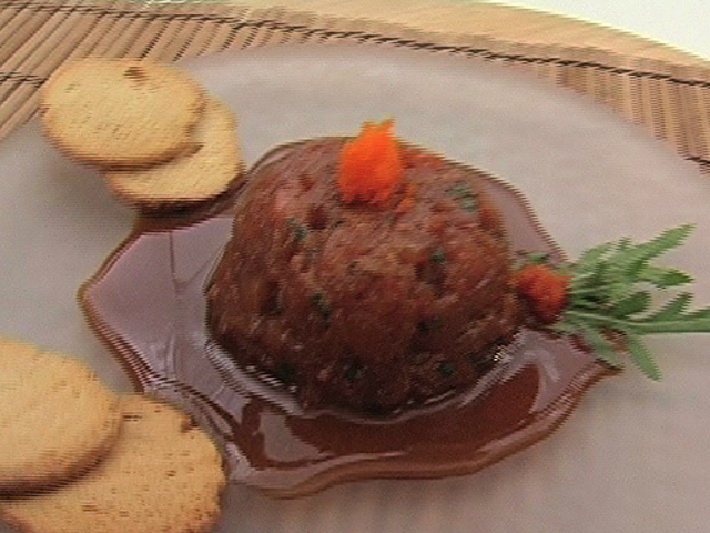 Вкусное и простое блюдо — лосось тартар.Состав:лосось — 50 гр;имбирь — 1 штука;сухарики «Мелба» — 7 кусочков;несколько листьев салата;белая паста мисо, соевый соус, вода, сахар, тобико, чивас — по вкусу.